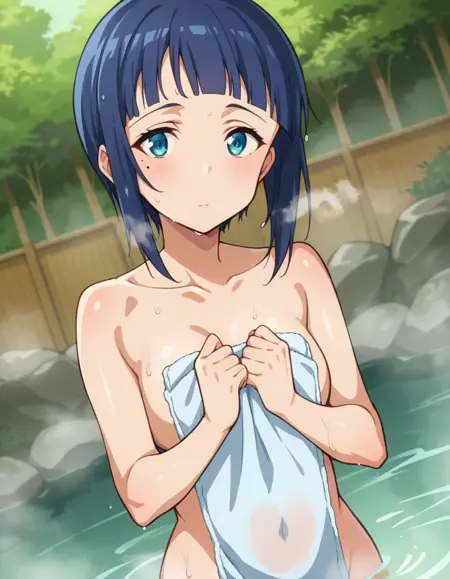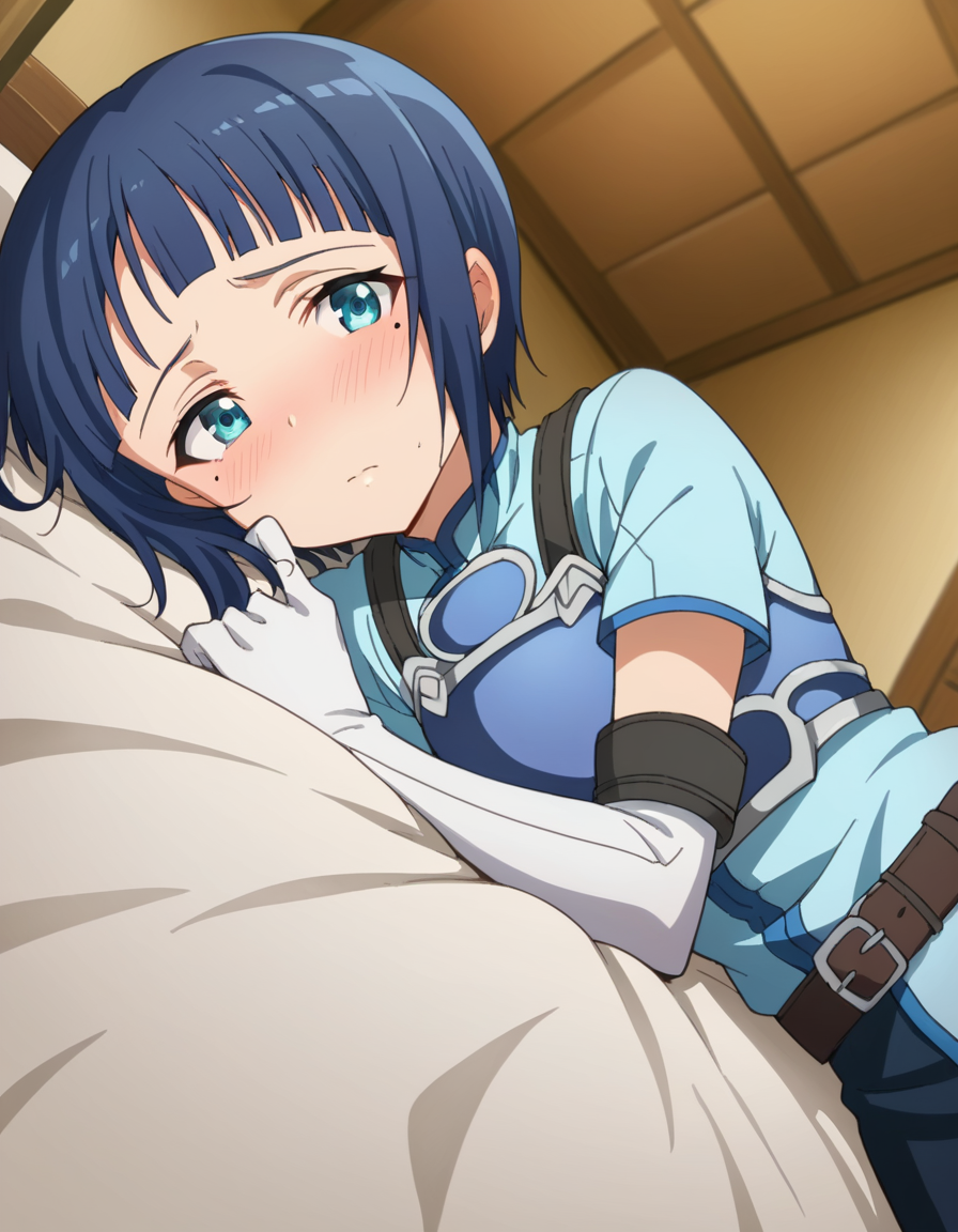sachi, short hair, blue eyes, blue hair, mole, mole under eye, bangs, blunt bangs,
