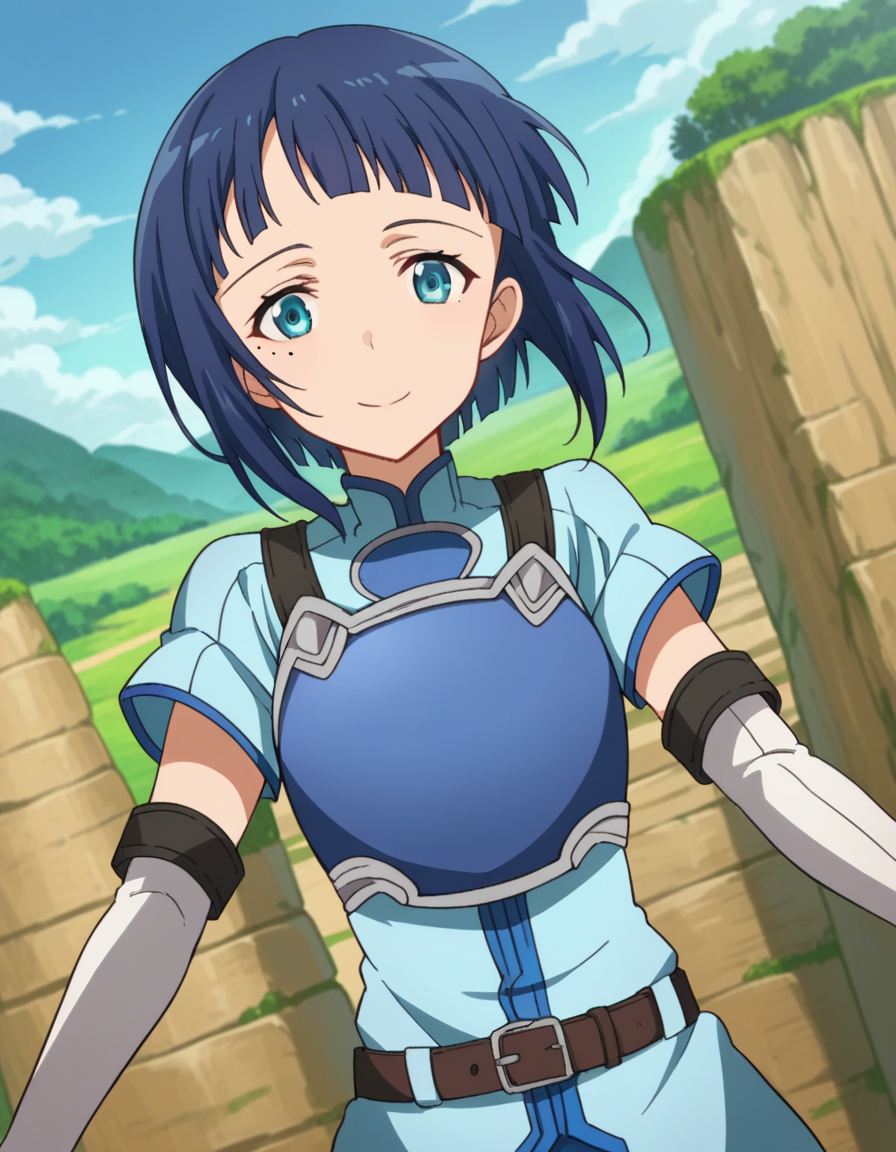 gloves, elbow gloves, belt, armor, breastplate, shirt, blue shirt,