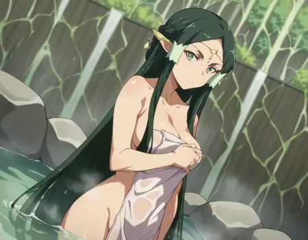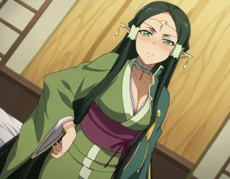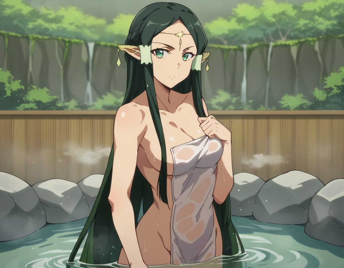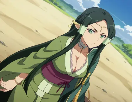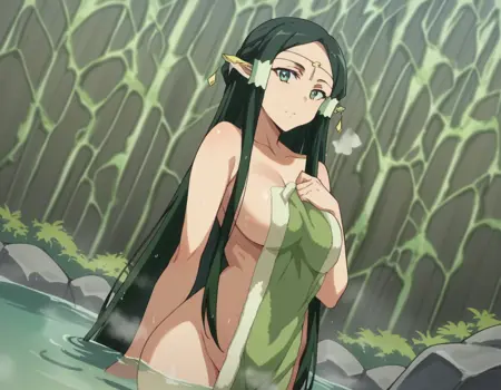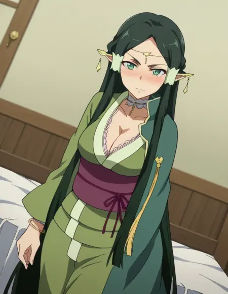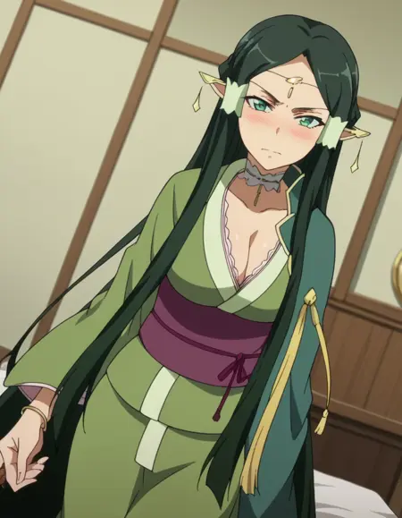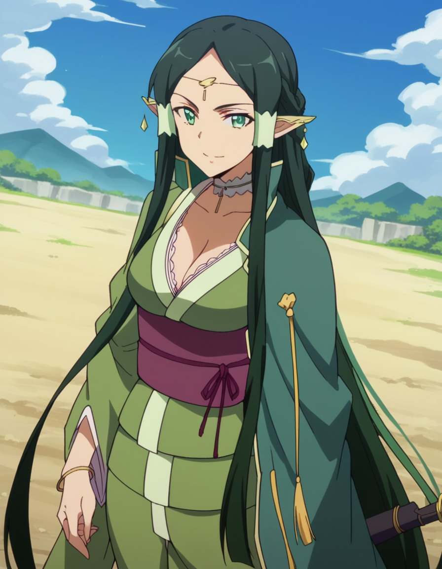 sakuya, 長い髪, 黒髪, 非常に長い髪, 緑の目, 緑の髪, 尖った耳, 髪のチューブ, エルフ, 耳カバー, 濃い緑の髪,