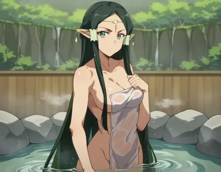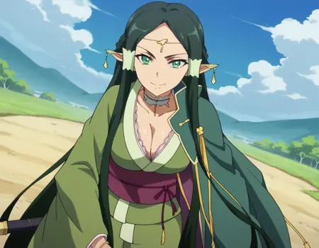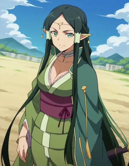sakuya, long hair, black hair, very long hair, green eyes, green hair, pointy ears, hair tubes, elf, ear covers, dark green hair,