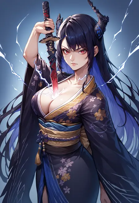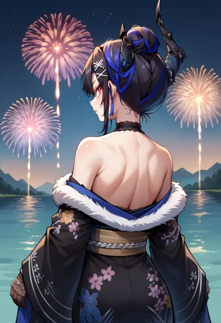 NerissaNewYears, streaked hair, black hair, blue hair, red eyes, slit pupils, uneven horns, hair bun, hair flowers, hairclip, tassel earrings, frilled choker, black kimono, feather-trimmed kimono, floral print, white fur scarf, black lace gloves