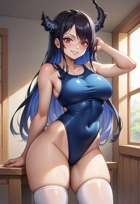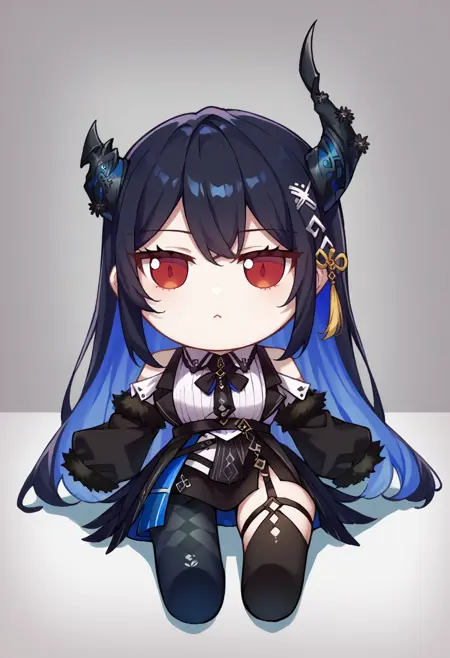 NerissaBase, colored inner hair, black hair, blue hair, red eyes, slit pupils, uneven horns, long hair, hair ornament, black ribbon, fur-trimmed sleeves, black sleeves, collared shirt, white shirt, ribbed shirt, shoulder cutout, black gloves, black skirt, miniskirt, side slit, singe leg pantyhose, checkered pantyhose, black thighhighs, asymmetrical legwear