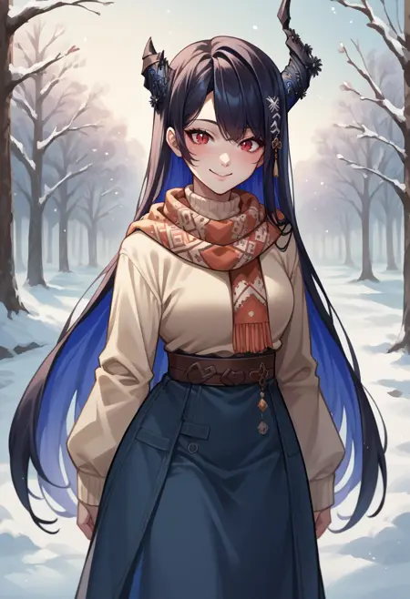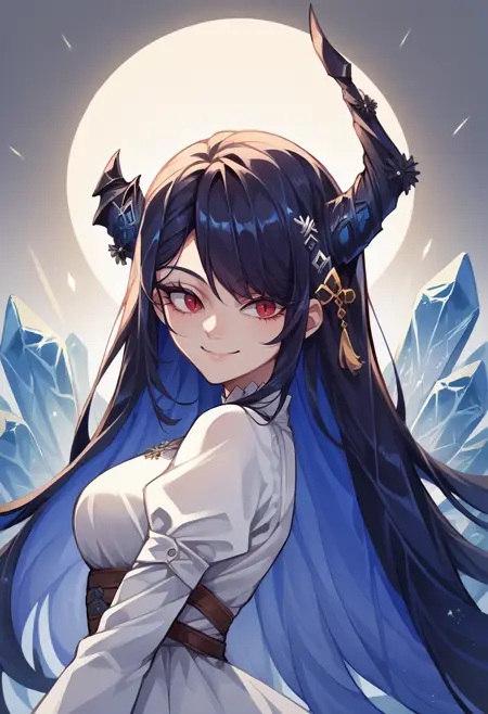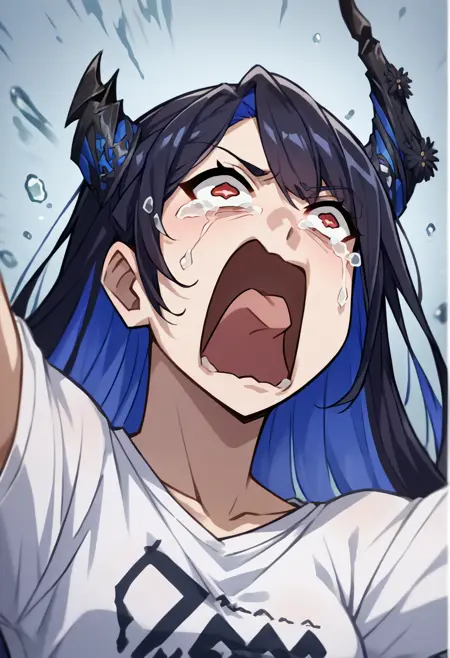 NerissaRavencroft, colored inner hair, black hair, blue hair, red eyes, slit pupils, uneven horns, long hair