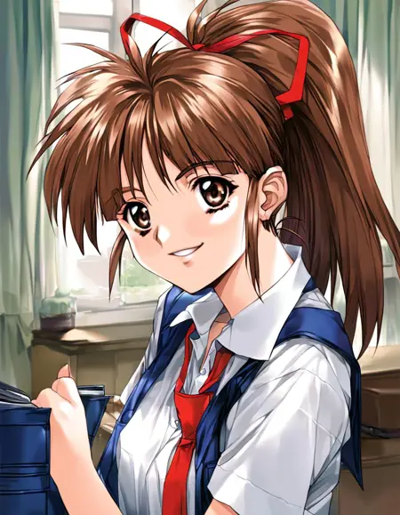 Tanaka_Misa(Doukyuusei), 1girl, solo, brown hair, high ponytail, brown eyes, long hair, hair ribbon, medium breasts,