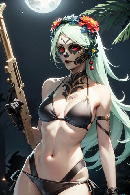 example prompt:Dota2Muerta, 1girl, calavera, glowing hair,red belt,hair_flower, red_eyes, flower, glowing, grass, hair_ornament, holding, holding_weapon, jewelry, outdoors, solo, tree, weapon