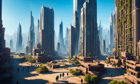 "tk-env 고대 환경 스타일의 사진, 페르시아 도시, 사람들이 걸어다니는 모습, 고대 페르시아의 도시, 도시 곳곳에 팔라우가 자라며, 꽃이 여기저기 퍼져 있는 모습, 수상작 이미지, 매우 높은 디테일"