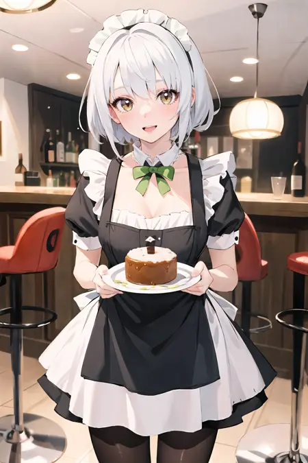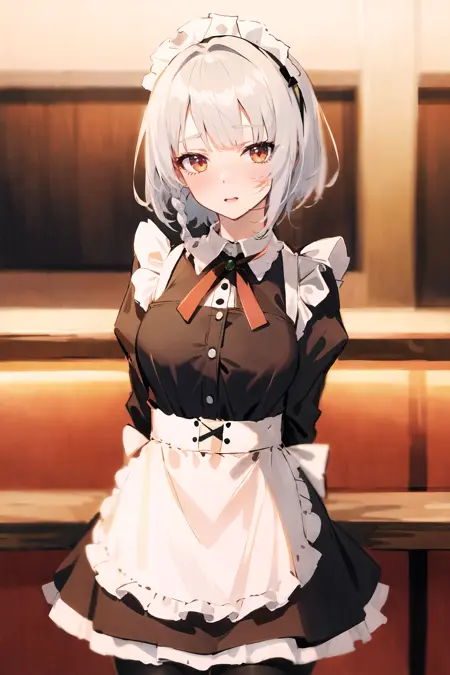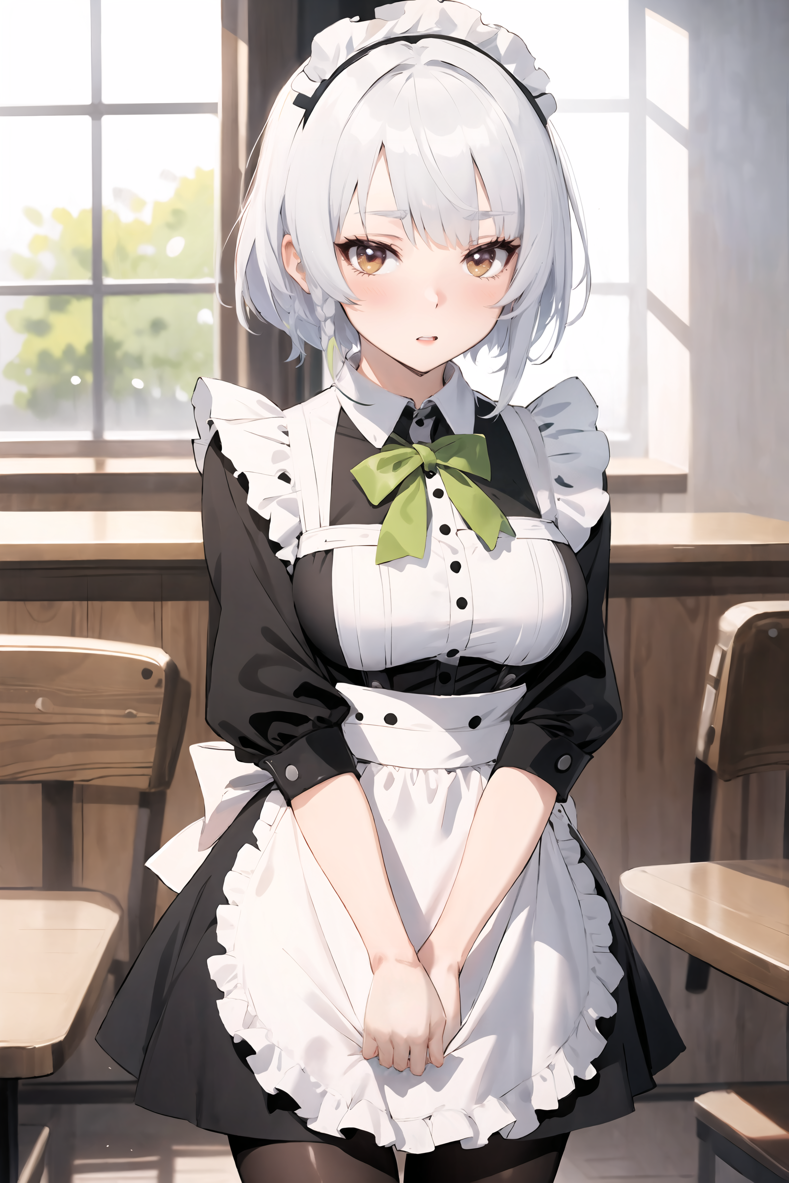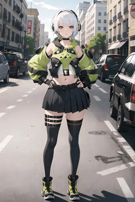 她的默认游戏内女仆服装额外提示词:黑色过膝袜、黑色百褶裙、耳机、露指手套、项圈、短款夹克、可拆卸袖子、大腿绑带