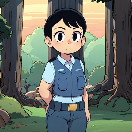 1girl, solo, MissOfficer, black eyes, short hair, black hair, chubby, short sleeves, collared shirt, blue vest, belt, pants,