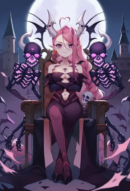 IronmouseUnderworld, 紫色眼睛, 魔鬼角, 魔鬼女孩, 魔鬼尾巴, 魔鬼翅膀, 尖耳, 心形呆毛, 刘海, 长发, 心形耳环, 辫子, 呆毛, 耳后头发, 心形发饰, 眼球, 饰品, 黑色连衣裙, 裸露肩膀, 肘套, 耳环, 肚脐, 锁骨, 服装镂空, 黑色手套, 骷髅, 无吊带连衣裙, 高跟鞋, 头饰, 肚脐镂空