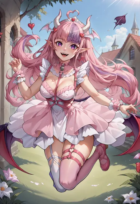 IronmouseDemonPrincess, 紫色眼睛, 魔鬼角, 魔鬼女孩, 魔鬼尾巴, 魔鬼翅膀, 尖耳, 心形呆毛, 刘海, 头部翅膀, 心形发饰, 长发, 荷叶边, 白色连衣裙, 暴露胸部, 项圈, 粉色连衣裙, 荷叶边连衣裙, 不对称腿部穿搭, 不匹配腿部穿搭, 大腿带, 粉色鞋履, 铃铛, 粉色过膝袜, 白色过膝袜, 裸露手臂, 手腕束缚带
