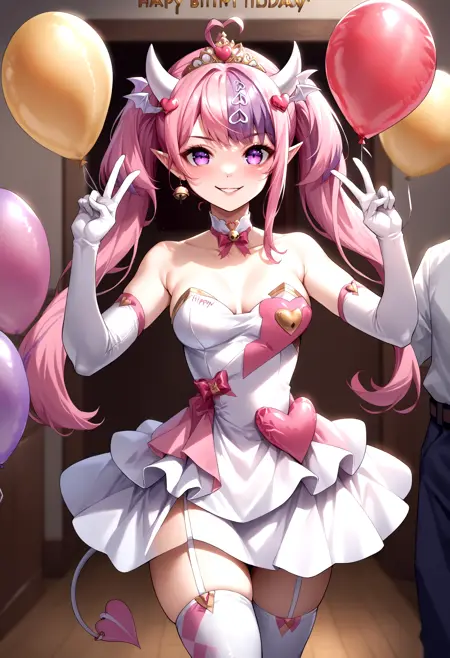 IronmouseBirthD, 紫色眼睛, 魔鬼角, 魔鬼女孩, 魔鬼尾巴, 魔鬼翅膀, 尖耳, 心形呆毛, 长发, 刘海, 心形发饰, 双马尾, 白色手套, 白色连衣裙, 项圈, 铃铛, 肘套, 王冠, 过膝袜
