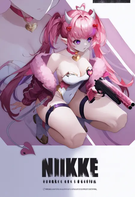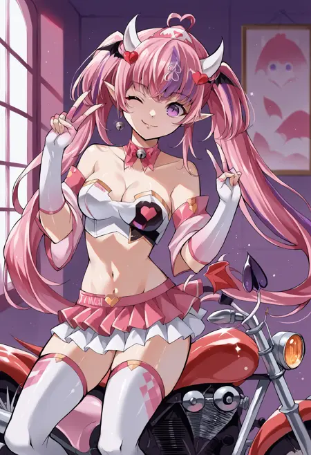 IronmouseRaceQueenV1, 紫色眼睛, 魔鬼角, 魔鬼女孩, 魔鬼尾巴, 魔鬼翅膀, 尖耳, 双马尾, 心形呆毛, 心形发饰, 长发, 暴露胸部, 肚脐, 露腹, 超短裙, 绝对领域, 铃铛, 项圈, 白色过膝袜, 露肩, 分离衣领, 无吊带, 粉色夹克, 露肩, 裸露肩膀, 短上衣, 超短裙