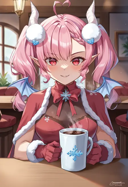 IronmouseWinter, 红色眼睛, 魔鬼角, 魔鬼女孩, 魔鬼尾巴, 魔鬼翅膀, 尖耳, 心形呆毛, 辫子, 刘海, 双马尾, 长发, 蓝色火焰, 红色连衣裙, 连裤袜, 红色蝴蝶结, 斗篷, 雪花印花, 红色手套, 毛皮镶边靴子, 毛皮镶边连衣裙