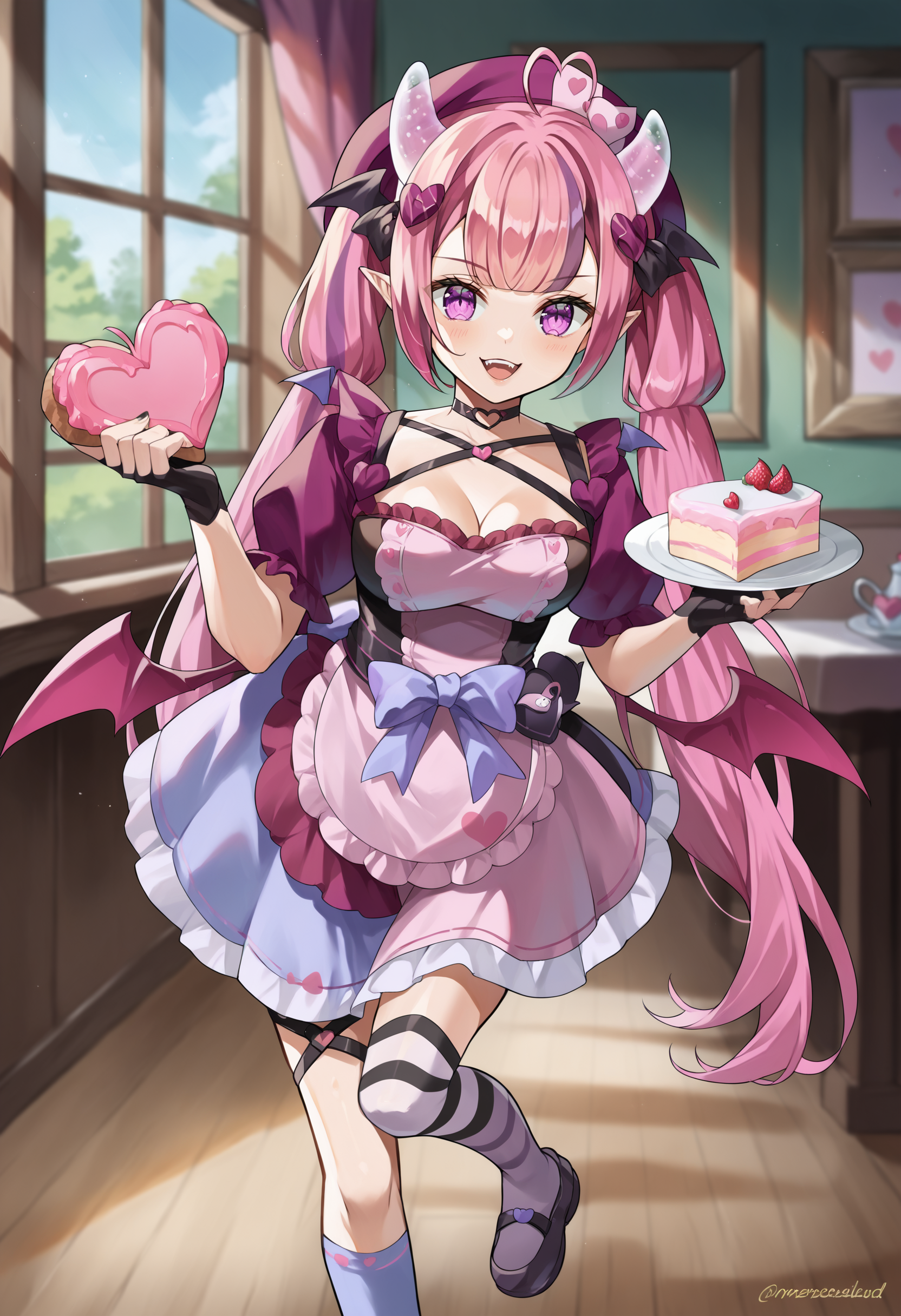 IronmouseTrickstar, 紫色眼睛, 魔鬼角, 魔鬼女孩, 魔鬼尾巴, 魔鬼翅膀, 尖耳, 双马尾, 长发, 心形发饰, 心形呆毛, 项圈, 暴露胸部, 暴露胸部镂空, 粉色过膝袜, 短裙, 肚脐, 露腹, 短上衣, 荷叶边, 粉色夹克