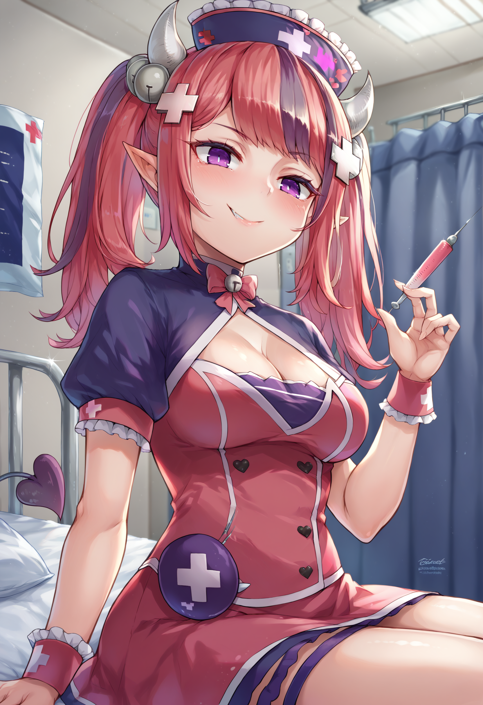 IronmouseNurse, 紫色眼睛, 魔鬼角, 魔鬼女孩, 魔鬼尾巴, 魔鬼翅膀, 尖耳, 双马尾, x形发饰, 服装镂空, 暴露胸部镂空, 护士帽, 铃铛, 短袖, 手腕束缚带, 不对称腿部穿搭