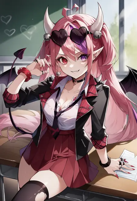 IronmouseSchoolTime, 异瞳, 紫色眼睛, 红色眼睛, 魔鬼角, 魔鬼女孩, 魔鬼尾巴, 魔鬼翅膀, 尖耳, 长发, 饰品, 心形呆毛, 心形发饰, 刘海, 耳环, 头戴眼镜, 项圈, 黑色夹克, 太阳镜, 红色短裙, 上衣, 手镯, 戒指, 领带, 铃铛, 尖刺, 暴露胸部, 黑色过膝袜, 破损腿部穿搭