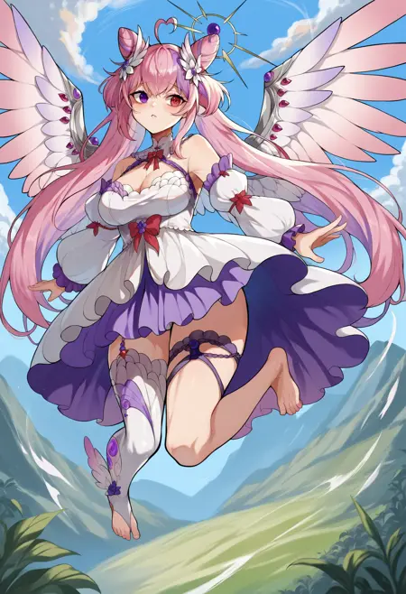 IronmouseFallenAngel, 异瞳, 紫色眼睛, 红色眼睛, 天使翅膀, 双发髻, 头发装饰, 心形呆毛, 刘海, 头发花朵, 暴露胸部, 白色连衣裙, 分离袖子, 无脚连裤袜, 单侧过膝袜