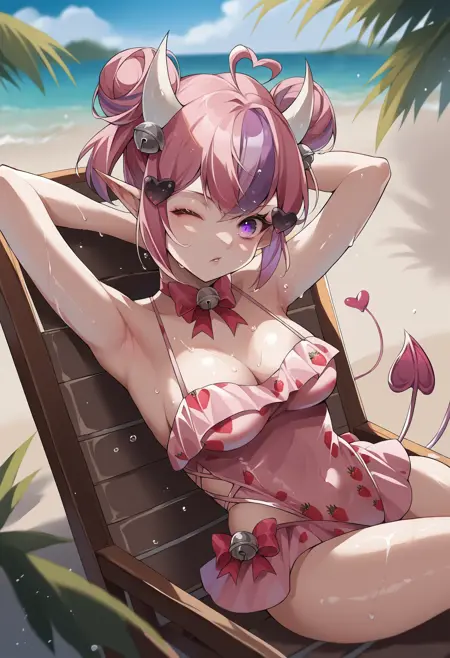 IronmouseSwimSuit, 紫色眼睛, 魔鬼角, 魔鬼女孩, 魔鬼尾巴, 魔鬼翅膀, 尖耳, 发髻, 心形呆毛, 心形发饰, 蝴蝶结, 双发髻, 食物印花, 暴露胸部, 粉色连体泳衣, 草莓印花, 铃铛, 短裙