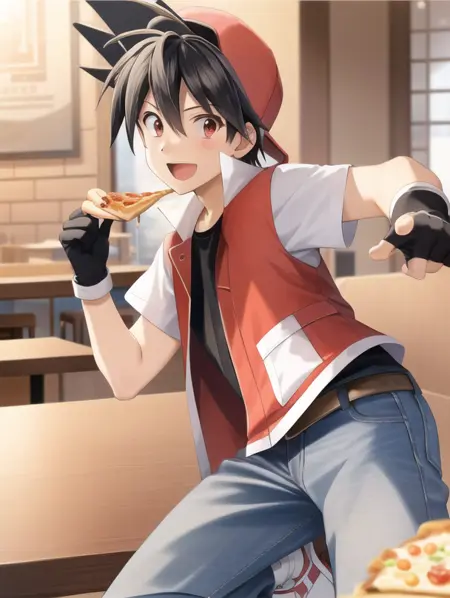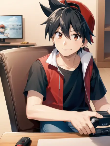 PokespeRed, jacket, red jacket, classic jacket, shirt, black shirt, cap, red cap, backwards cap, jeans, blue jeans, gloves, black gloves, fingerless gloves, white sneakers