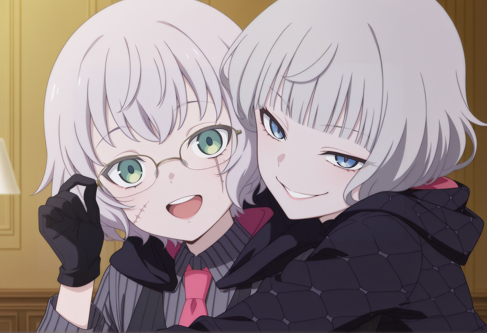 1단계: 짧은 머리, 회색 머리, 파란 눈, 가슴 노출, 흰색 단정한 재킷, 긴 드레스, 안경, 후드, 후드 올림