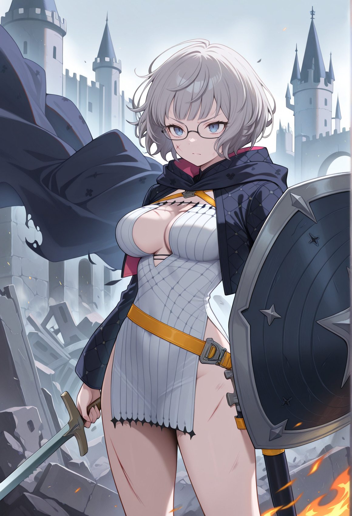 2단계: 짧은 머리, 회색 머리, 파란 눈, 가슴 노출, 검은 단정한 재킷, 짧은 드레스, 안경, 후드, 벨트
