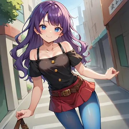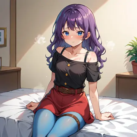 black shirt,collarbone,bare shoulder,shoulder straps,short sleeves,red skirt,purple pantyhose,miniskirt