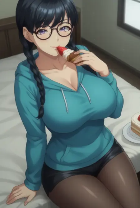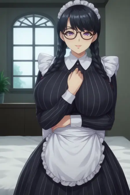 기본 의상: ["ren takahara, 보라색 눈, 검은 머리, 쌍꼬리 땋은 머리, 점, 검은 프레임 안경, 메이드 헤드기어, 메이드, 검은 드레스, 검은 셔츠, 줄무늬 드레스, 세로 줄무늬 드레스, 프릴 스커트, 언더버스트"]