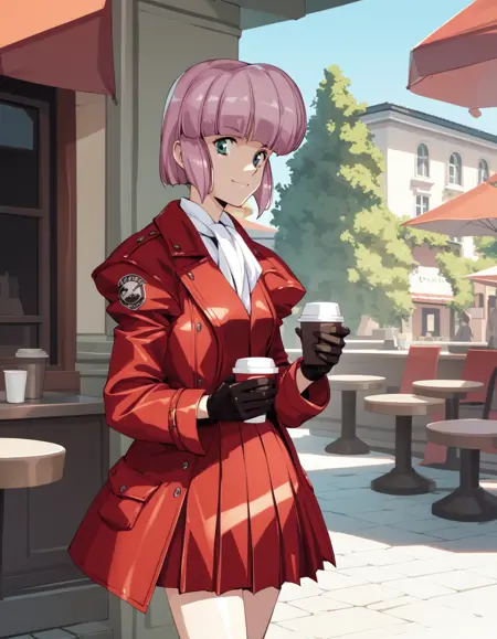 아웃피트: gloves, long sleeves, pleated skirt, red skirt, puffy sleeves, red coat