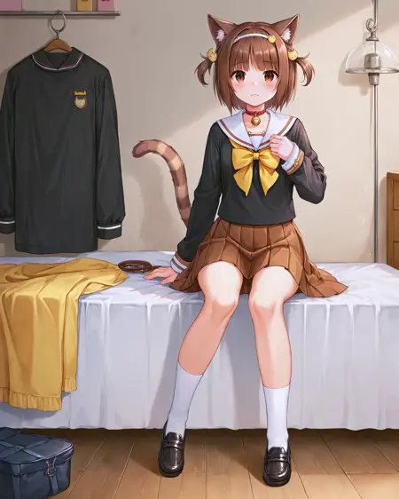 | Trained Words | azuki, brown hair, bangs, brown eyes, cat girl, cat ears, cat tail, striped tail, Copied! bow, yellow bow, ribbon, bell, neck bell, hair ribbon, maid headdress, maid, frills, clothing cutout, cleavage cutout, short sleeves, puffy sleeves, wrist cuffs, puffy short sleeves, apron, waist apron, frilled apron, bare legs, socks, white legwear, shoes, high heels, brown footwear, Copied! bow, yellow bow, ribbon, bell, neck bell, hair ribbon, hair ornament, maid headdress, light yellow dress, frills, cleavage, light yellow sleeves, long sleeves, sleeves past wrists, puffy sleeves, wrist cuffs, puffy short sleeves, apron, waist apron, frilled apron, long socks, white legwear, shoes, high heels, light yellow footwear, Copied! short hair, bow, collar, choker, bell, hairband, hair ornament, school uniform, shirt, black shirt, long sleeves, skirt, pleated skirt, brown skirt, socks, white socks, white legwear, shoes, serafuku, black footwear, Copied! short hair, hair ornament, choker, collar, bell, neck bell, sailor, sailor collar, blue sailor collar, red necktie, shirt, white shirt, sleeveless shirt, bare shoulders, sleeveless, bare arms, skirt, blue skirt, pleated skirt, socks, white socks, shoes, serafuku, blue footwear, Copied! short hair, ribbon, hair ribbon, collarbone, sleepwear, yellow sleepwear, pajamas, short sleeves, animal print, barefoot, Copied! |