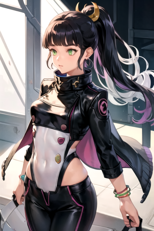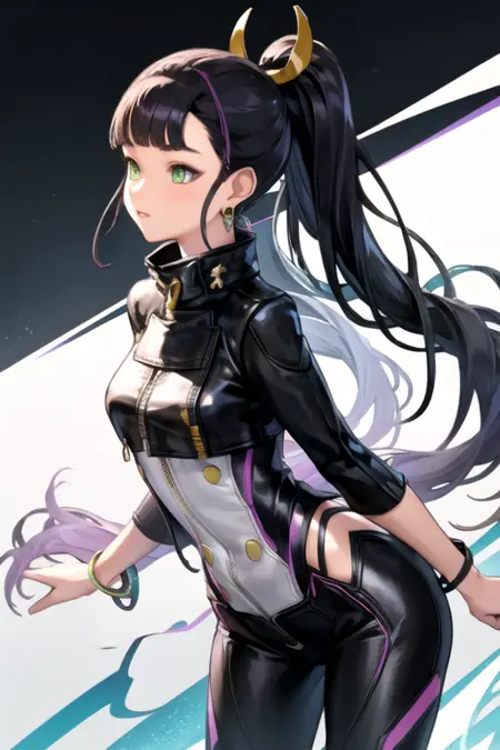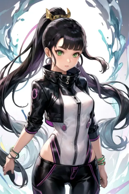 KikyoAnotherEden, 1girl, solo, very long hair, black hair, hair ornament, jewelry, green eyes, jacket, ponytail, earrings, bodysuit, bracelet, black pants, zipper,