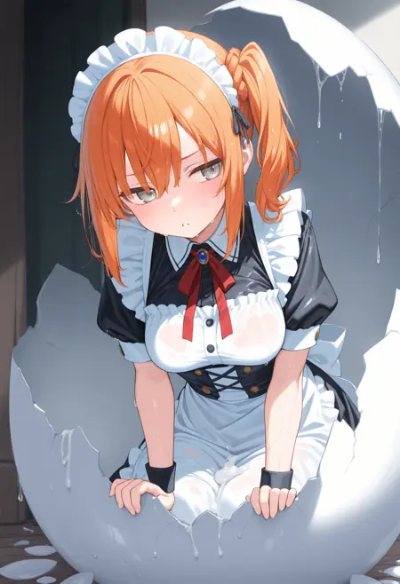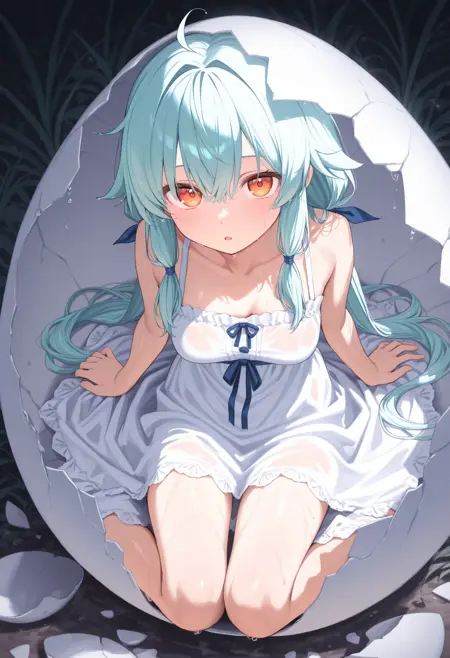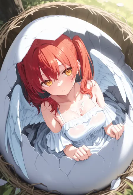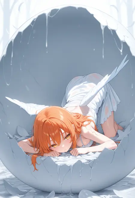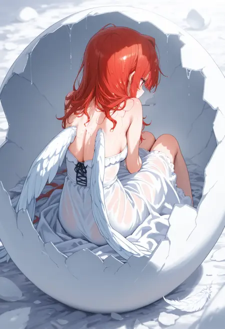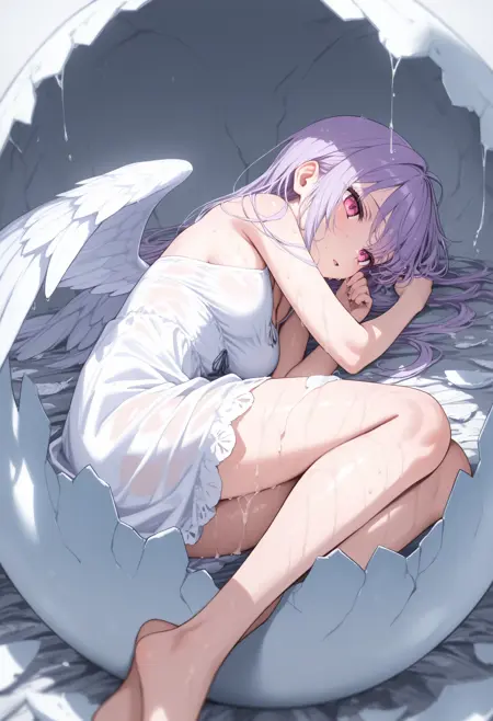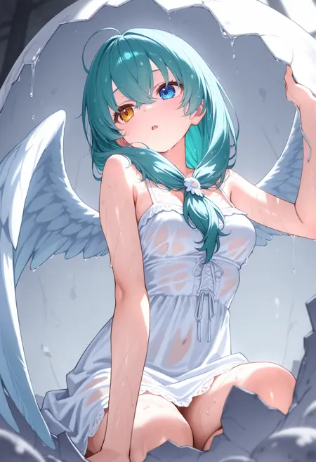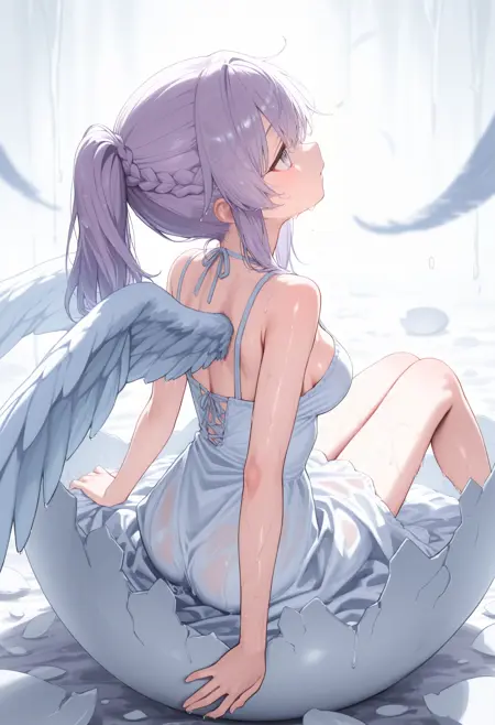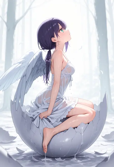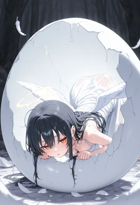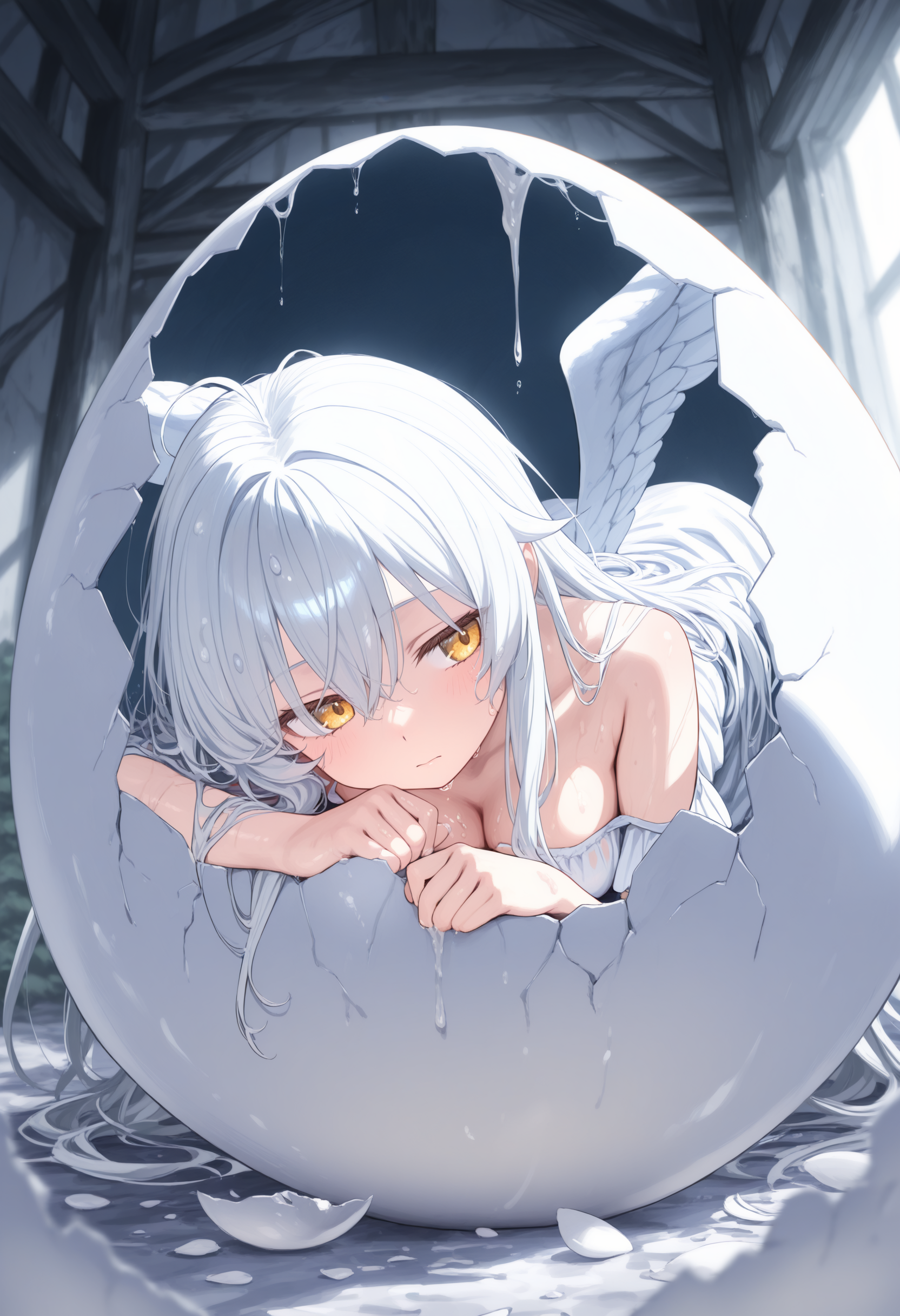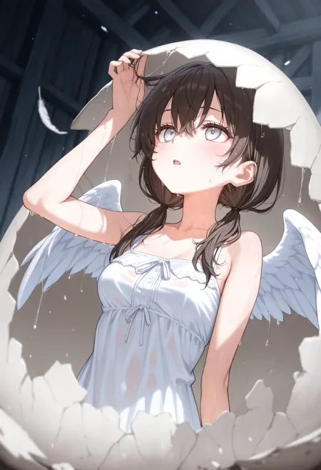 eggshell をお守り代わりに含めることで、プロンプトに追加してさまざまな状況を描写できます。例えば、卵から出てきたので濡れていてほしい場合は、slime (substance)、suggestive fluid、wet、wet clothes、wet hair などを追加してください。卵から天使が生まれるというイメージならば、wings、feathers、white dress、angel wings、white wings、feathered wings などを追加すると表現できます。