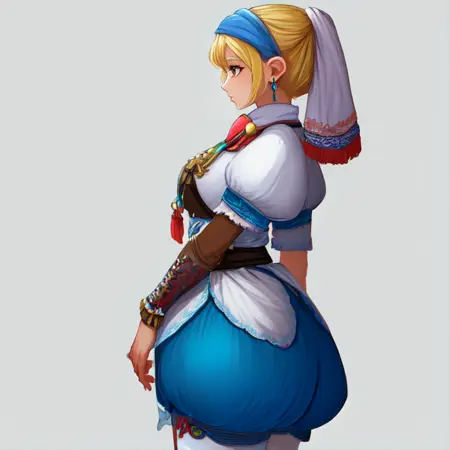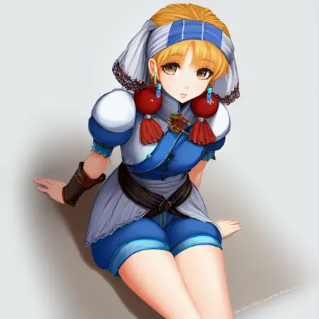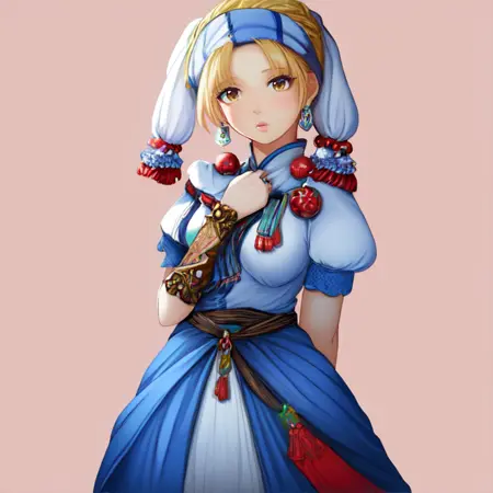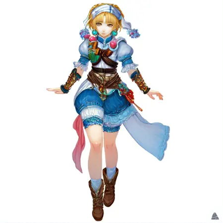 Yeah, another addition to Grandia series loras and it seems that this my 2nd character lora for "Elena" as well... Oh well, small dataset made training a bit challenging, especially as Elena's clothing has many details to it. The official outfit sports some weird dangling baubles on cloth strings on her sides, but despite trying to include them in training it doesn't seem to have worked.
