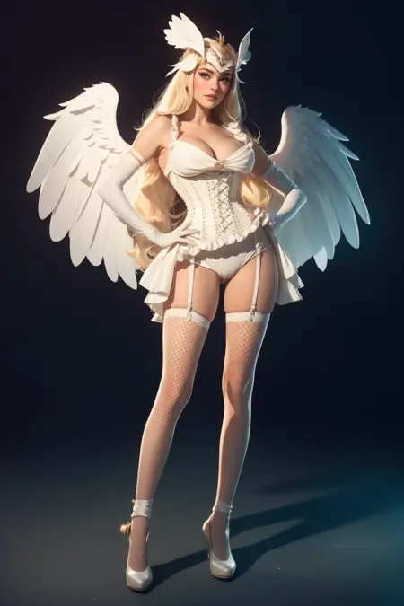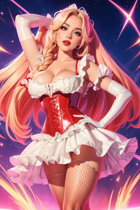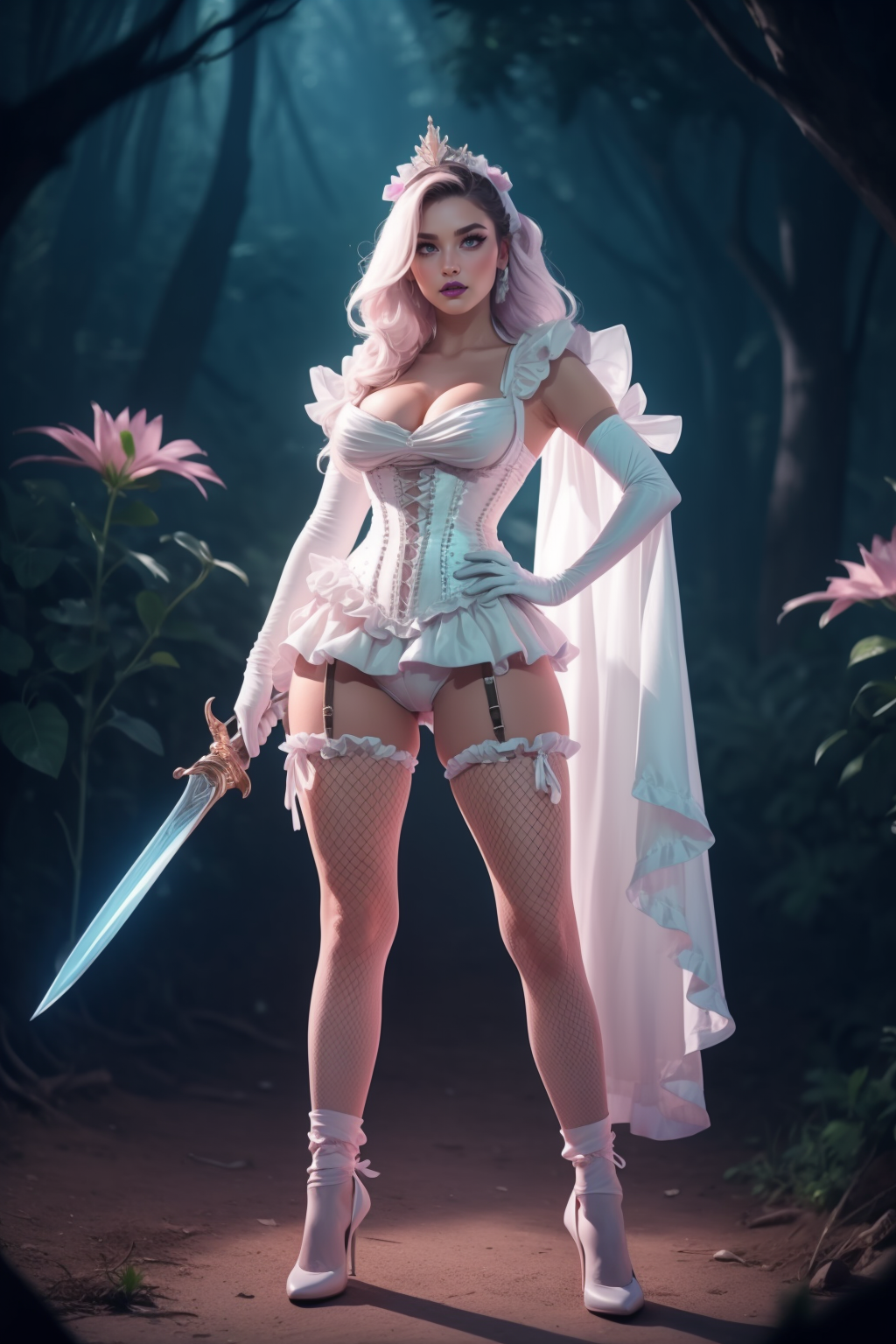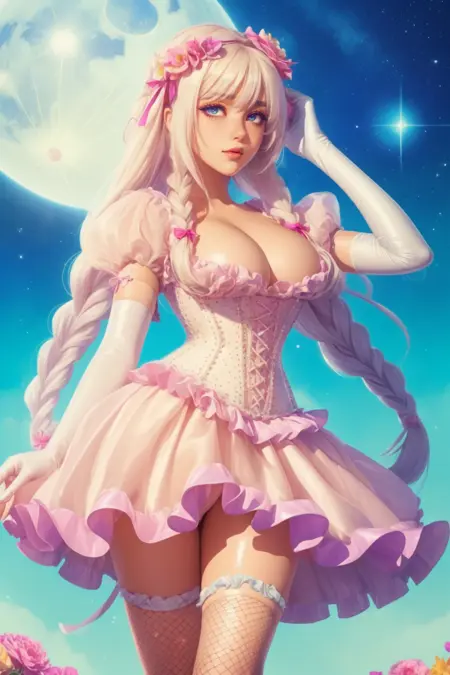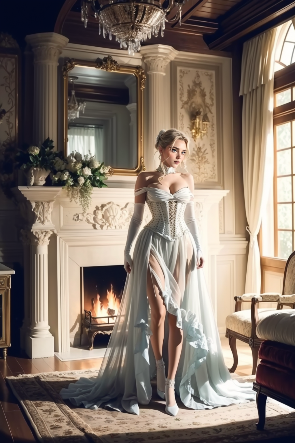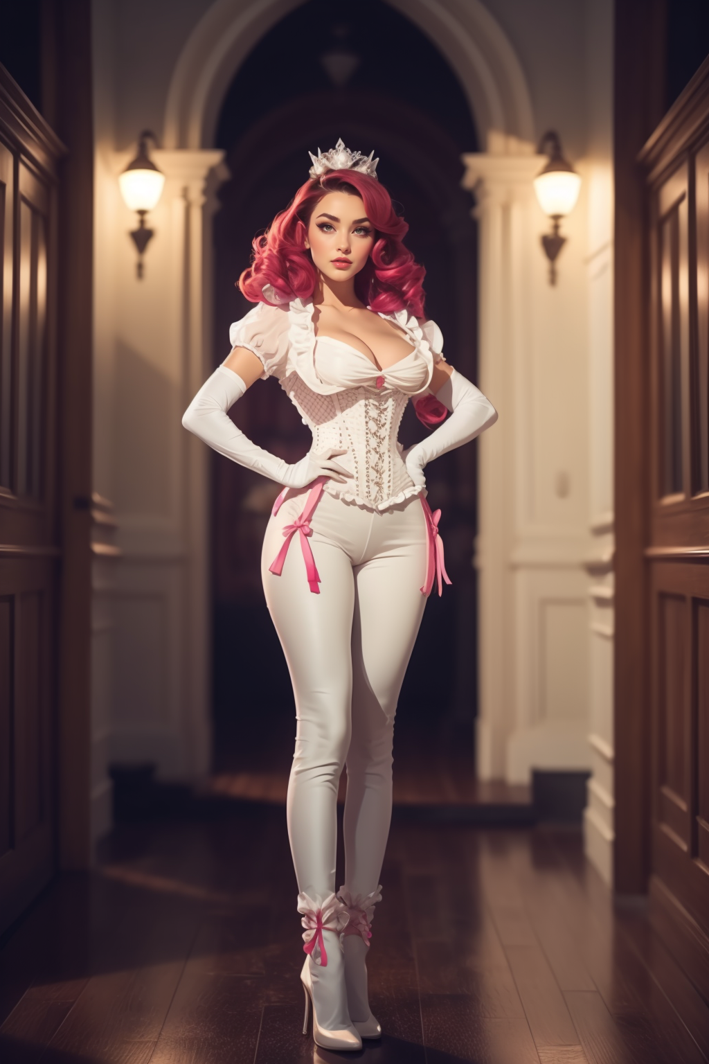 这是一款镶有珍珠的紧身胸衣,搭配高裙、肘部手套,内衬缎面/闪亮尼龙褶皱上衣,以及网眼丝袜和荷叶边袜子。整体设计相当模块化,但在应用于胸部或臀部区域时,建议使用合适的面料——更倾向于褶皱效果。不过,姿势摆放相当麻烦,因此我建议加入一些如手叉腰、站立等姿势,以缓和手臂的动作。