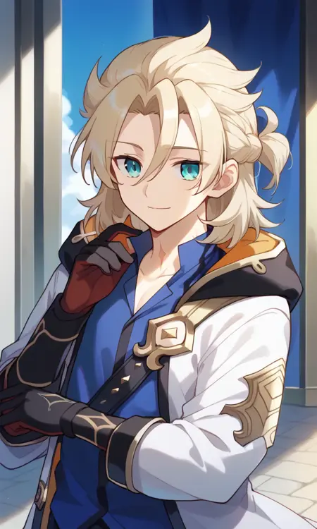트리거 단어: 알베도, 금발, 눈 사이의 머리카락, 청록색 눈, 셔츠, 파란 셔츠, 코트, 흰 코트, 목의 흉터, 장갑, 검은 장갑