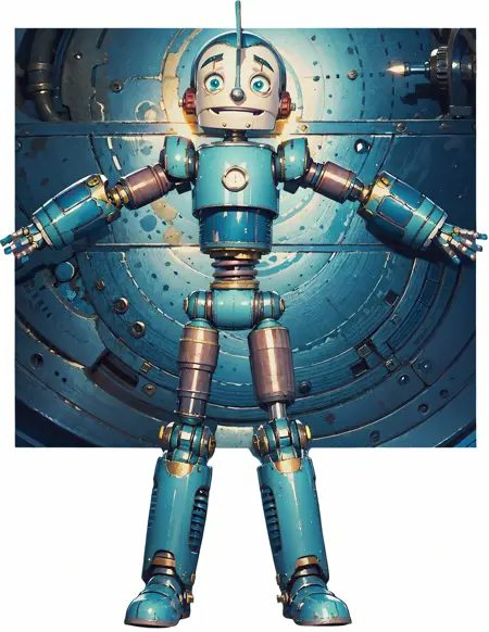 ‘rodney(robots)’, ‘rodney copperbottom’, ‘robots(2005)’, ‘android’, ‘humanoid robot’, ‘robot joints’, ‘robotic face’, ‘seams’, ‘spring’, ‘robot ears’, ‘shiny skin’ 등의 프롬프트(트리거 단어)로 이 멋진 로봇 주인공의 그림을 생성하실 수 있을 것입니다.
