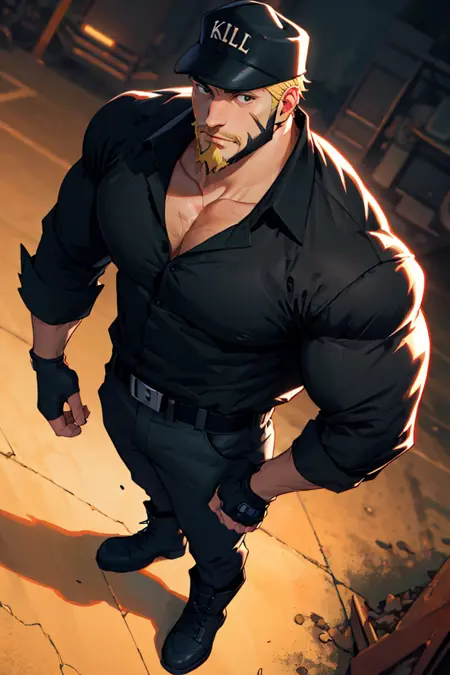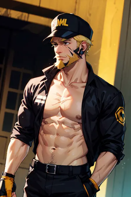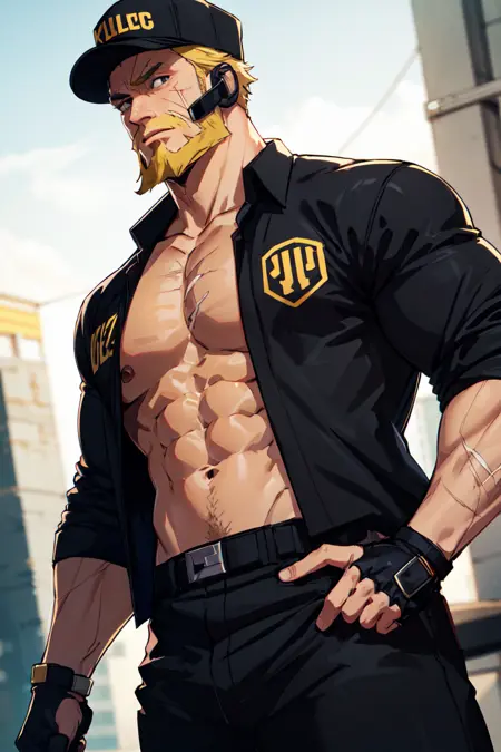 Killer T Cell, tan skin, blond hair, black eyes, facial hair, beard, scar on face