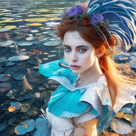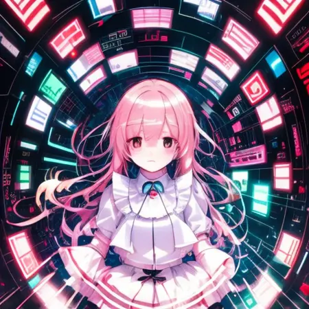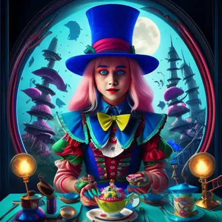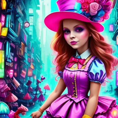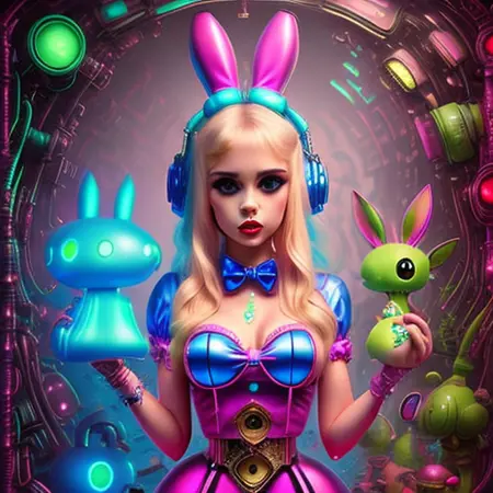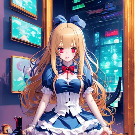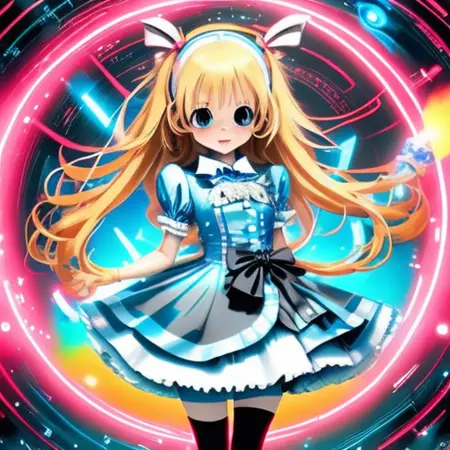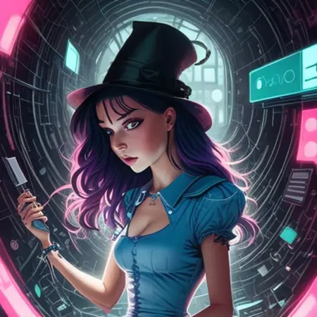 『アリスの不思議な冒険』の要素を取り入れつつ、テクノロジー的な歪みを加えたイメージを制作してください!アリスはデジタル世界とどう関わり合うでしょうか?