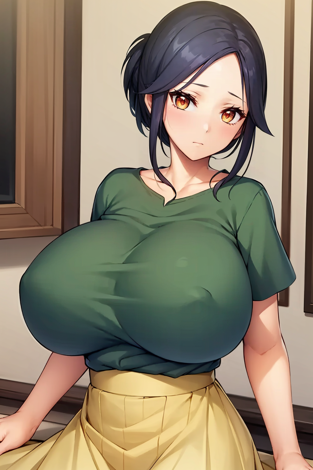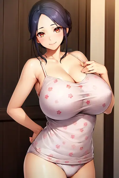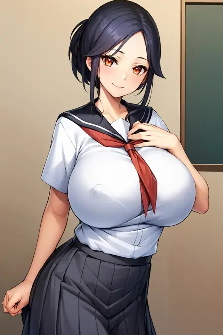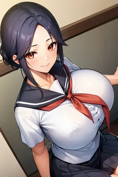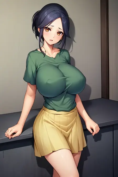 黑发,成熟女性,巨乳,单发髻,棕眼,鬓发,分刘海,额头