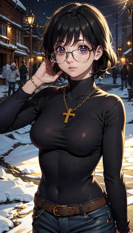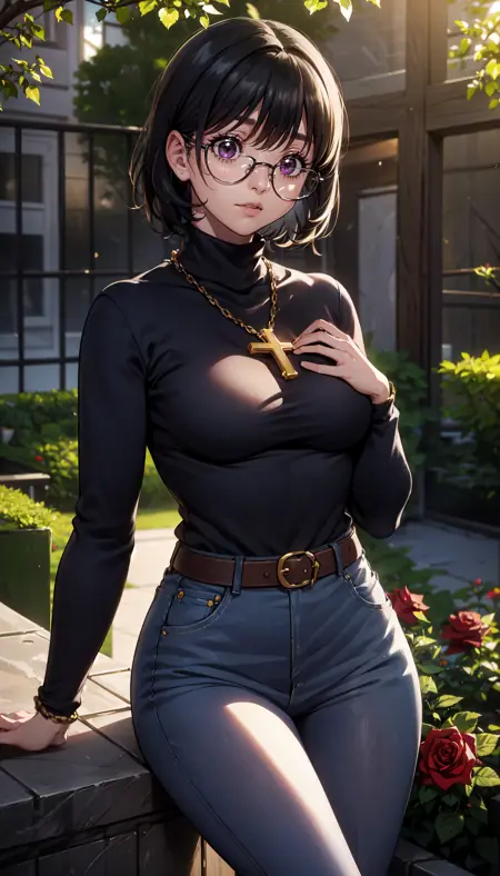 short hair, black hair, purple eyes, glasses, black turtleneck, long sleeves, gold necklace, cross necklace, jeans, belt