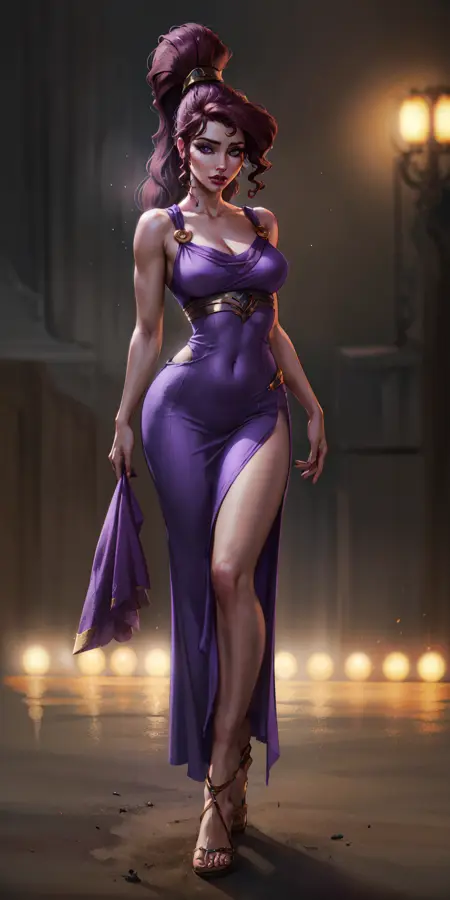 클래식한 옷차림: 긴꼬리머리, 긴 머리카락, 어깨 노출, 긴 보라색 드레스