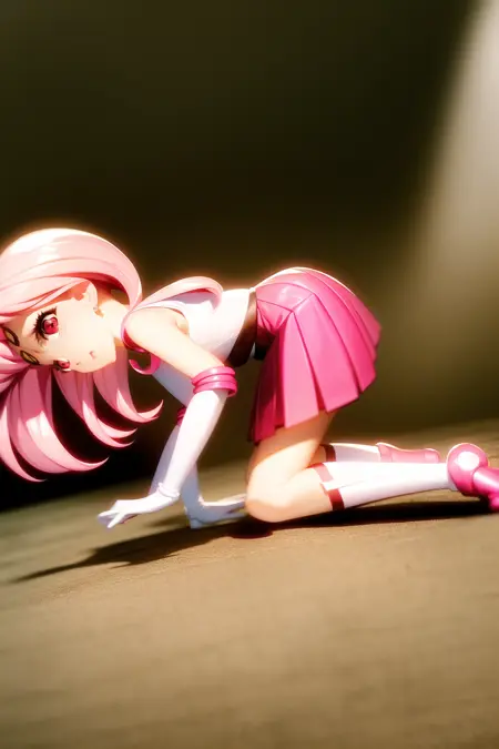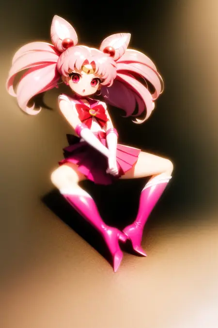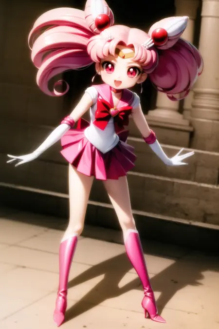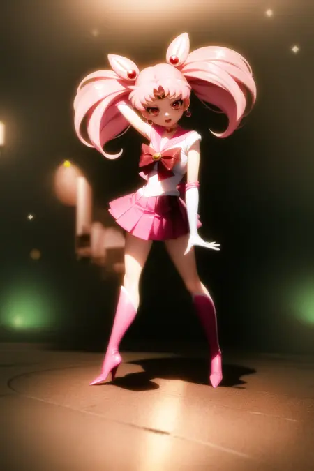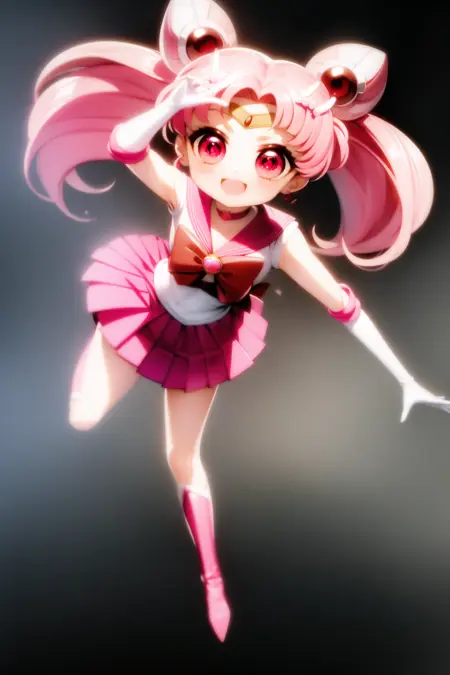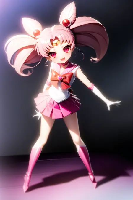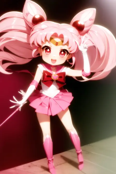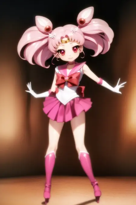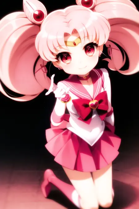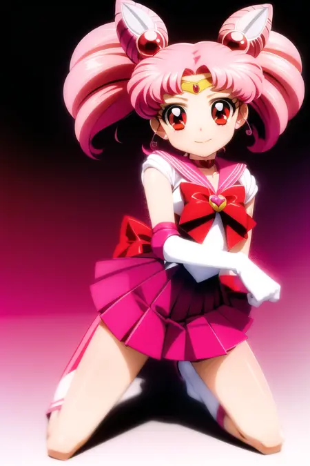 ちびうさ、1人女子、ヘアピン、ピンク髪、白手袋、ピンクのスカート、ミニスカート、赤い目、チョーカー、赤いリボン、ジュエリー、ちびうさ、ゲームCG、全身、SM制服