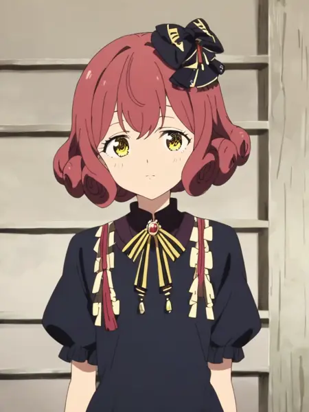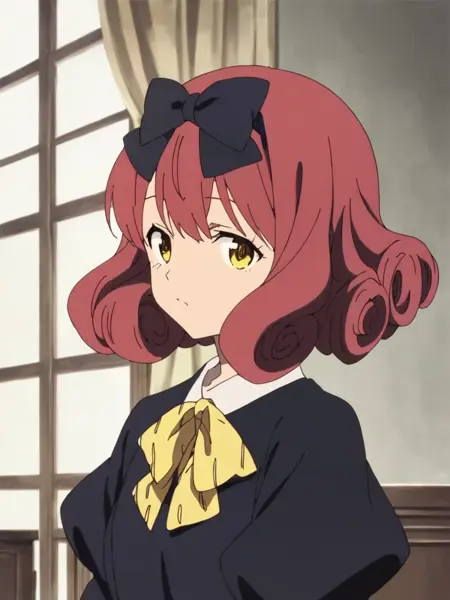 lou,yellow eyes,short hair, red hair,curly hair, bow, black dress,