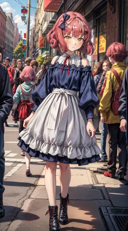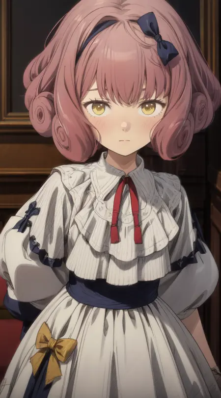 lou lora:lou:0.7, 黒いドレスを纏ったピンク髪の少女が立っている。首には赤い長めのリボンが結ばれ、黄色い目をしている。白いブラウスは首元と肩に gathers が施されており、首には赤いリボンが結ばれていて、色合いと洗練された雰囲気を加えている。濃紺のドレスまたはジャンパーで、こちらは長くルーズな袖が特徴で、とてもチャイカでモダンなルックを演出している。