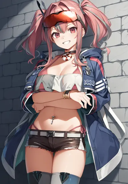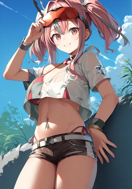 원본(origen): 브레머턴_(azur_lane), 배꼽 피어싱, 재킷, 크롭탑, 머리 장식, 머리에 안경, 짧은 반바지, 분홍색 네일, 이톤 레그웨어, 벨트, 옷속에 비키니, 초커, 귀 피어싱,