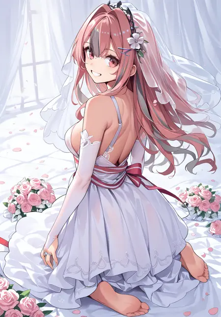 【서약】행복의 궤적(joyride_of_love): 브레머턴_(azur_lane), 긴 머리, 가터 스트랩, 흰색 레그웨어, 웨딩 드레스, 신부 장갑, 신부 베일, 헤어 꽃, collarbone,