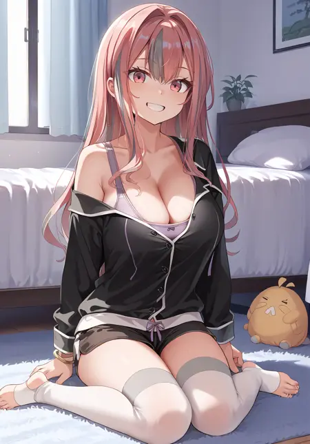 편안한 휴식 시간(relaxation_consultation): 브레머턴_(azur_lane), 긴 머리, 파자마, 흰색 발가락 없음 레그웨어, 스포츠 브라 스트랩, 팔찌, 미소, 검은 셔츠, 검은 반바지, 어깨 노출