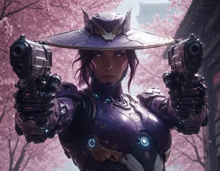 "score_9, score_8_up, score_7_up, score_6_up, score_5_up, score_4_up,(Female cyborg samurai character from Genshin Impact, wearing pink and white with an Asian style hat on her head, in the style of cyberpunk with robot body parts and high tech mechanical armor, robot arms, holding a glowing katana, standing im a magical flower garden, HD, masterpiece, best quality, hyper detailed, ultra detailed:1.2)"