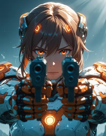 "masterpiece, best quality, amazing quality, very aesthetic, high resolution, absurdres, newest, photorealism, realistic,1girl, white hair, cuborg armor, white coat, holographic, hair ornament, green eyes, sunlight, temple in background, holding two pistols, pistols against her body, aiming at the ground, dynamic close up pose, cinematic, close up, cyborg samurai"