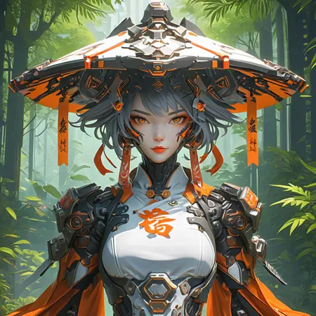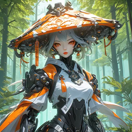 "Female cyborg samurai character from Genshin Impact, wearing orange and white with an Asian style hat on her head, in the style of cyberpunk with robot body parts and high tech mechanical armor, robot arms, standing inside a magical forest"