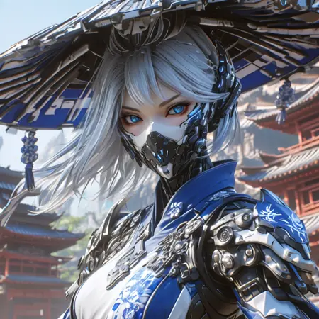 "masterpiece, best quality, amazing quality, very aesthetic, high resolution, absurdres, newest, photorealism, realistic,1girl, white hair, cuborg armor, white coat, holographic, hair ornament, green eyes, sunlight, temple in background, holding two pistols, pistols against her body, aiming at the ground, dynamic close up pose, cinematic, close up, cyborg samurai"